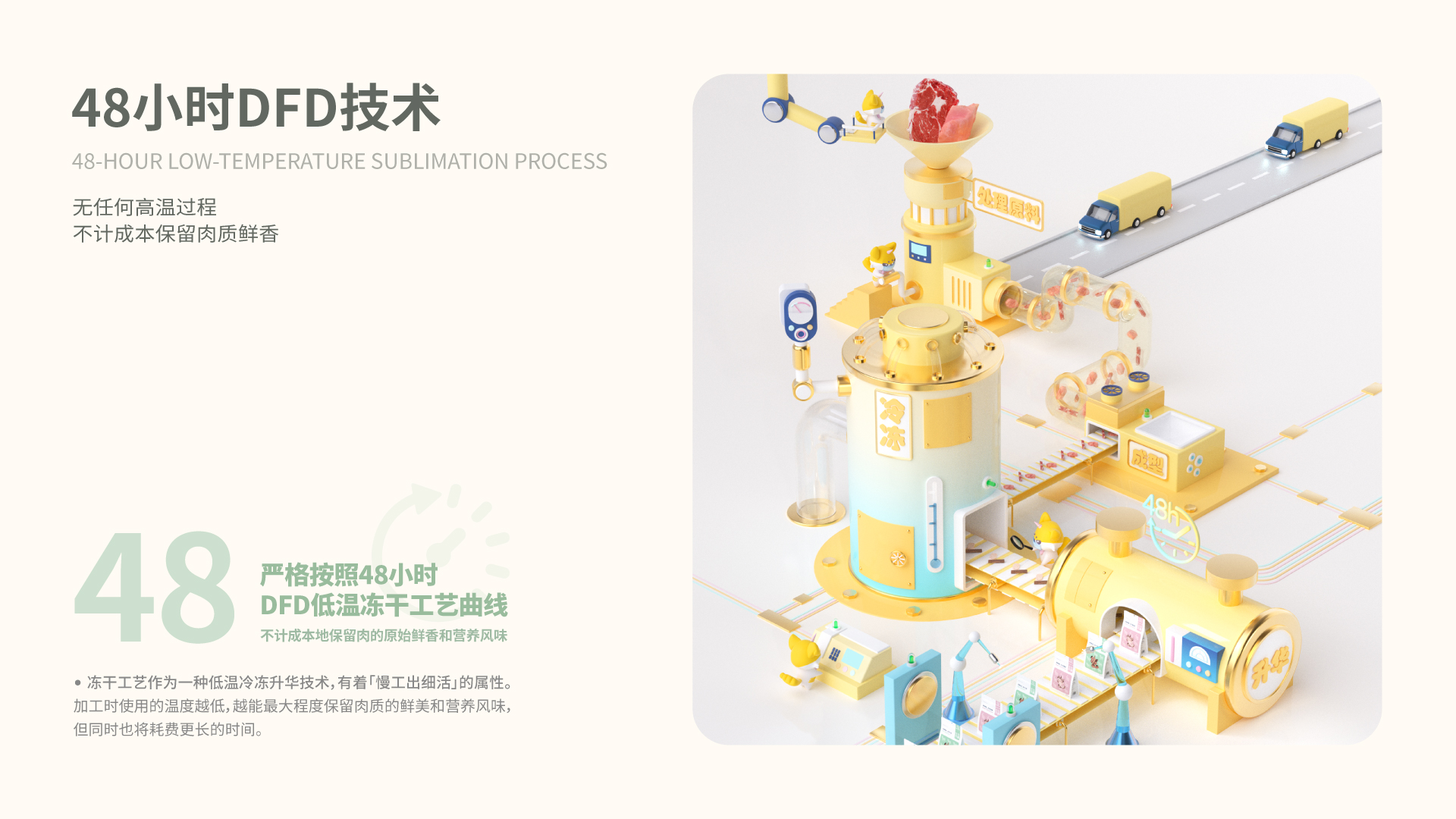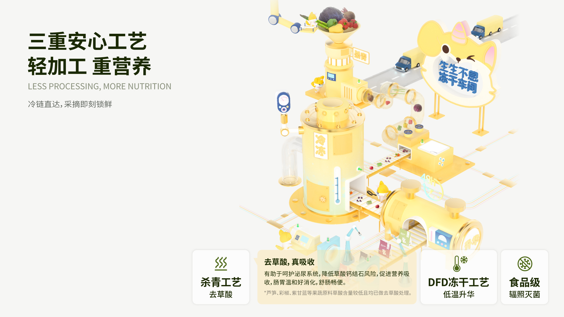 升华干燥法完美保存了食材的性状,避免了致癌的梅拉德反应产物。高端的冻干设备是发挥冻干优势的前提,我们的设备有效解决了产品易碎易软的情况,使冻干的性状得到显著提升。