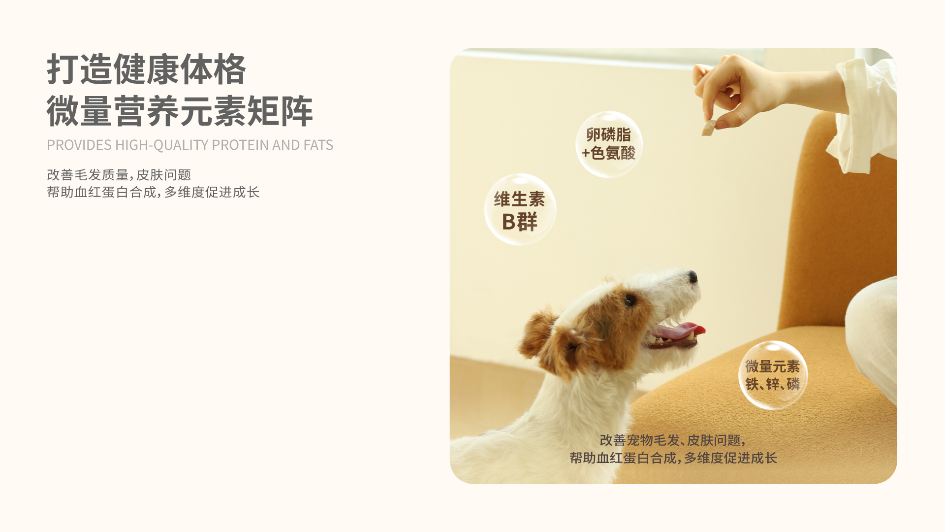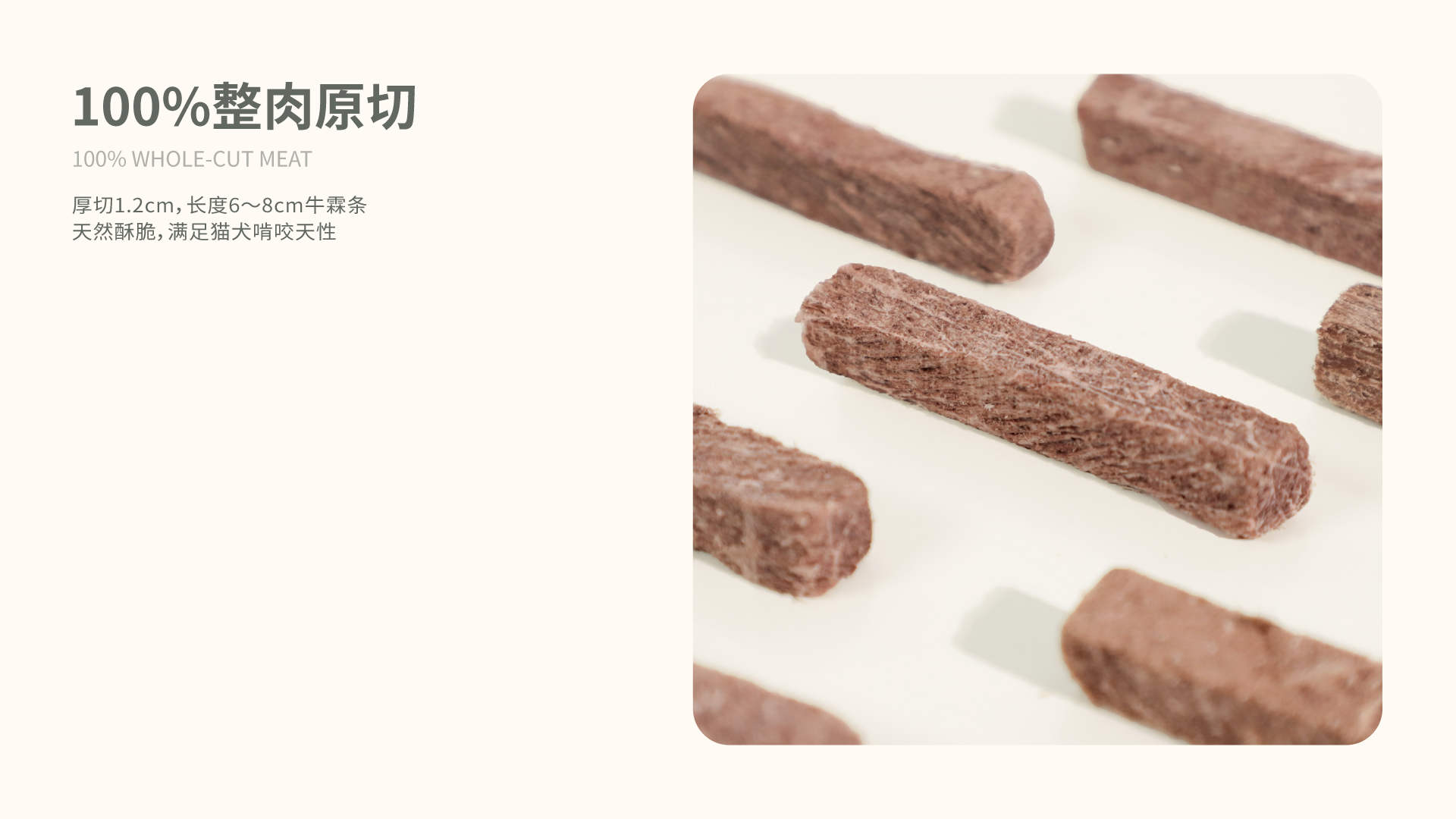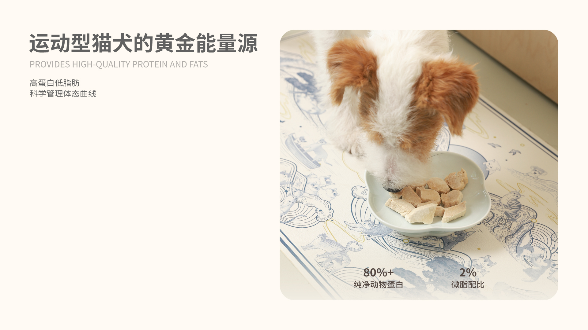 本品选用肉类作为能量来源,告别谷物淀粉,降低爱宠过敏、皮肤病、肥胖的风险。